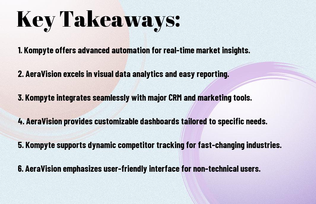 Kompyte offers a robust suite of tools designed to streamline your competitive analysis, but with AeraVision entering the scene, the decision becomes more complex. As you commence on selecting the right platform for 2025, it’s vital to weigh the unique features and potential drawbacks of both solutions. Evaluate your specific needs, from real-time insights to user-friendly interfaces, ensuring you align with a platform that enhances your strategic decision-making and supports your business goals effectively. This guide will help you navigate through the specifics of Kompyte and AeraVision to make an informed choice.